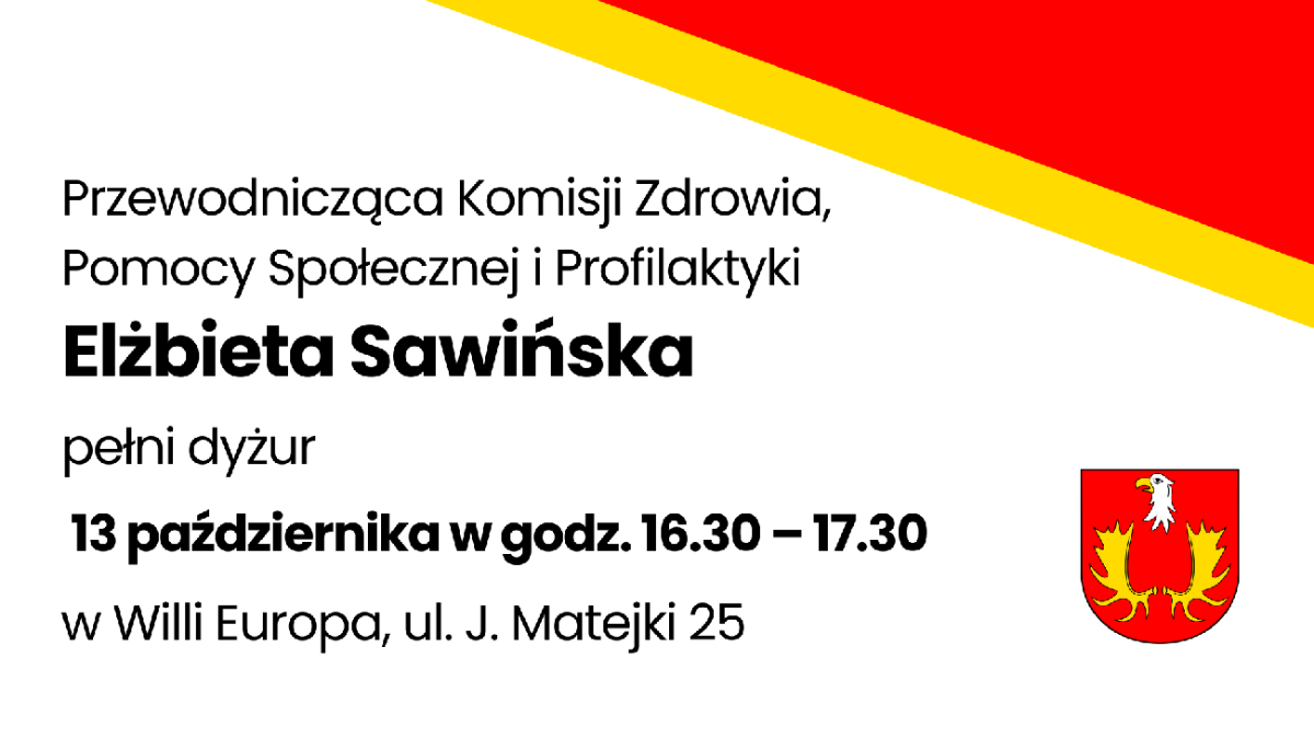 13 października w godz. 16:30–17:30 w Willi Europa przy ul. J. Matejki 25 w Izabelinie C dyżur pełnić będzie radna gminy Elżbieta Sawińska.