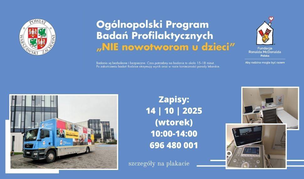Fundacja Ronalda McDonalda, we współpracy z partnerami, zaprasza rodziców i opiekunów na bezpłatne badania USG dzieci w wieku od 9 miesięcy do 6 lat. Najbliższa edycja programu „NIE nowotworom u dzieci” odbędzie się 18 października 2025 roku w Ożarowie Mazowieckim.