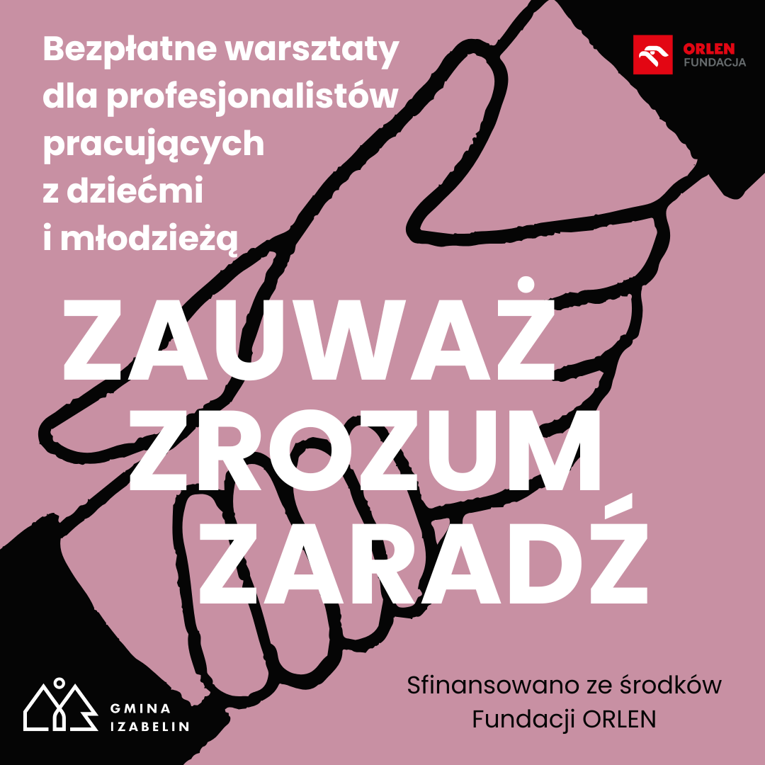 Zapraszamy osoby pracujące z dziećmi i młodzieżą z gminy Izabelin na bezpłatne dwudniowe warsztaty pt. „Zauważ, zrozum, zaradź – w trosce o dobro dzieci i młodzieży. Specjalistyczne warsztaty dla profesjonalistów pracujących z dziećmi i młodzieżą w gminie Izabelin”.