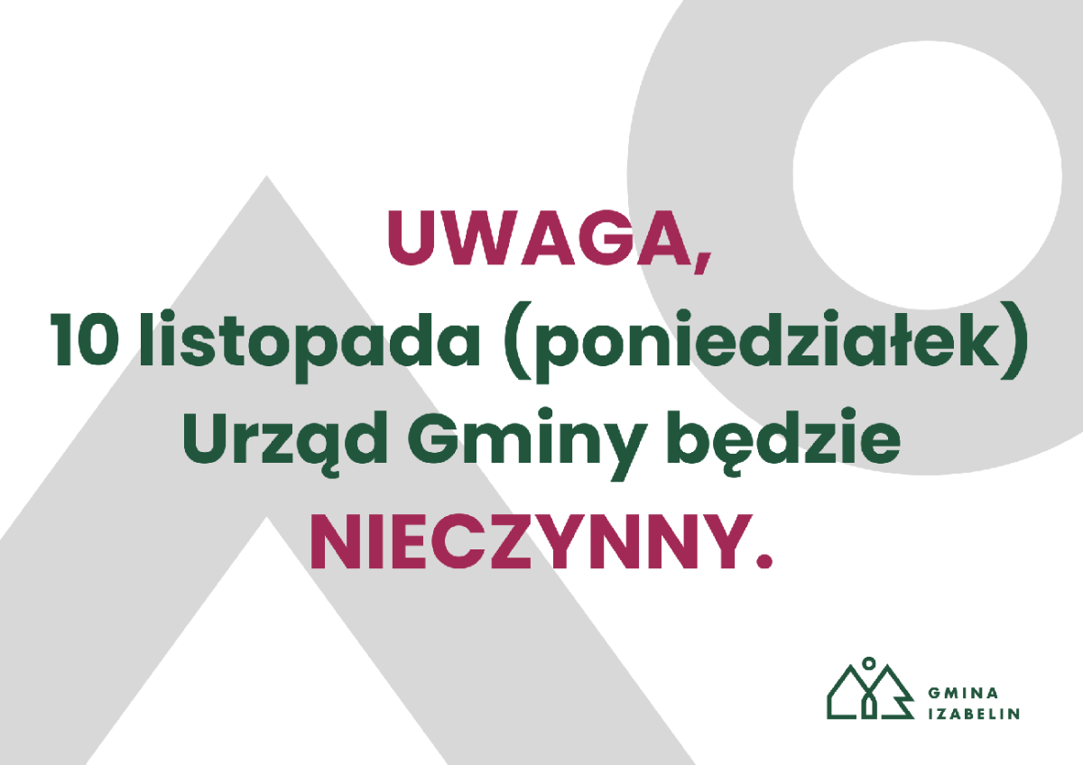 Zgodnie z Zarządzeniem nr 120/2025 Wójta Gminy Izabelin z 19 lutego 2025 r. w sprawie ustalenia dni wolnych od pracy w Urzędzie Gminy Izabelin w roku 2025 i terminu ich odpracowania 10 listopada br. jest dniem wolnym od pracy w Urzędzie Gminy Izabelin (w zamian za święto przypadające w sobotę 1 listopada 2025 r.).