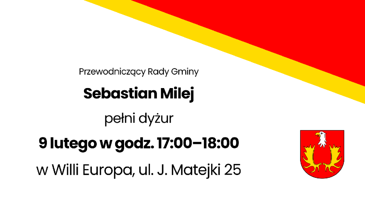 9 lutego w godz. 17:00–18:00 w Willi Europa przy ul. J. Matejki 25 w Izabelinie C dyżur pełnić będzie Przewodniczący Rady Gminy Sebastian Milej.