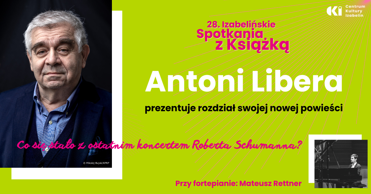W Izabelinie Antoni Libera zaprezentuje rozdział swojej nowej książki. Spotkanie będzie miało nie tylko literacki, ale i muzyczny charakter. Przy fortepianie zasiądzie Mateusz Rettner – utytułowany pianista i kompozytor z międzynarodowym dorobkiem artystycznym, absolwent Royal College of Music w Londynie.