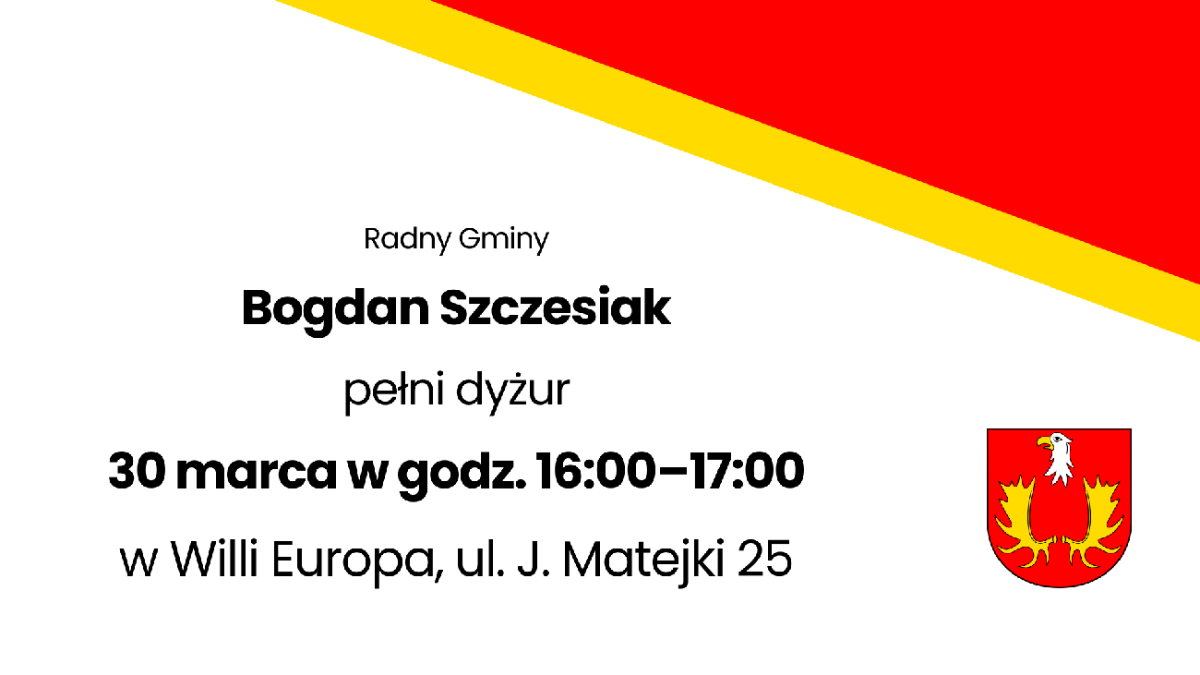 30 marca w godz. 16:00–17:00 w Willi Europa przy ul. J. Matejki 25 w Izabelinie C dyżur pełnić będzie radny gminy Bogdan Szczesiak.