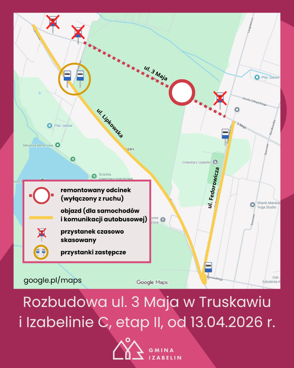 W związku z trwającą przebudową drogi powiatowej nr 4130W ul. 3 Maja w Truskawiu, od 13 kwietnia 2026 r. odcinek od ul. Langiewicza do ul. Parkowej będzie całkowicie wyłączony z ruchu. (Planowany termin umieszczony na tablicach przy budowie, czyli 9 kwietnia, został przesunięty na 13 kwietnia).