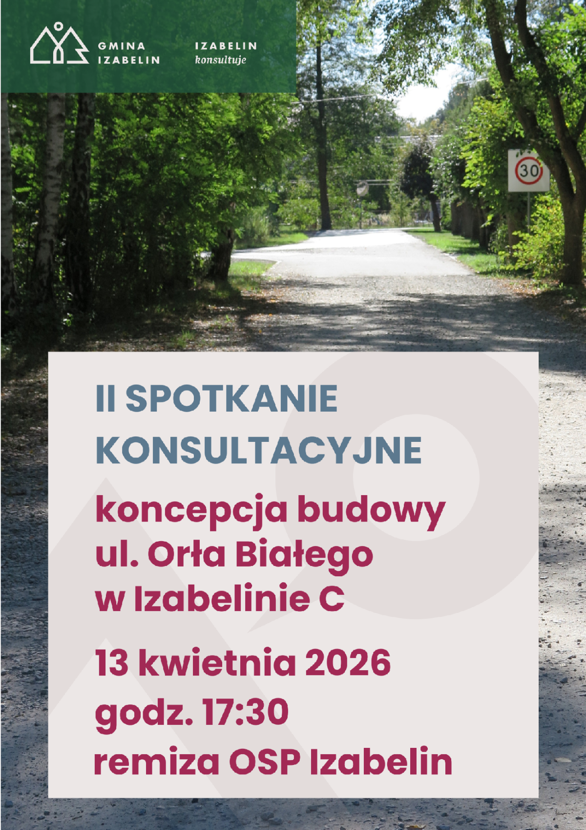 Zapraszamy na drugie spotkanie konsultacyjne, podczas którego projektant przedstawią dwie nowe koncepcje budowy ul. Orła Białego w Izabelinie C.